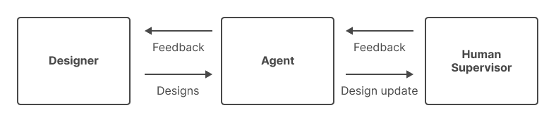 For visual creativity, the only difference is low level work (like design of some specific screen) is handled by a human. Agents and human designers work together on the low level and the high level. An agent can take a directive plus some memory and make design specs. An agent can then hire a designer and pass them specs. A human supervisor then reviews the designs upon submission and provides feedback to the designer either directly or through the agent. Design generation is done by a human and design review is done by a human, while facilitation is completed by the agent.